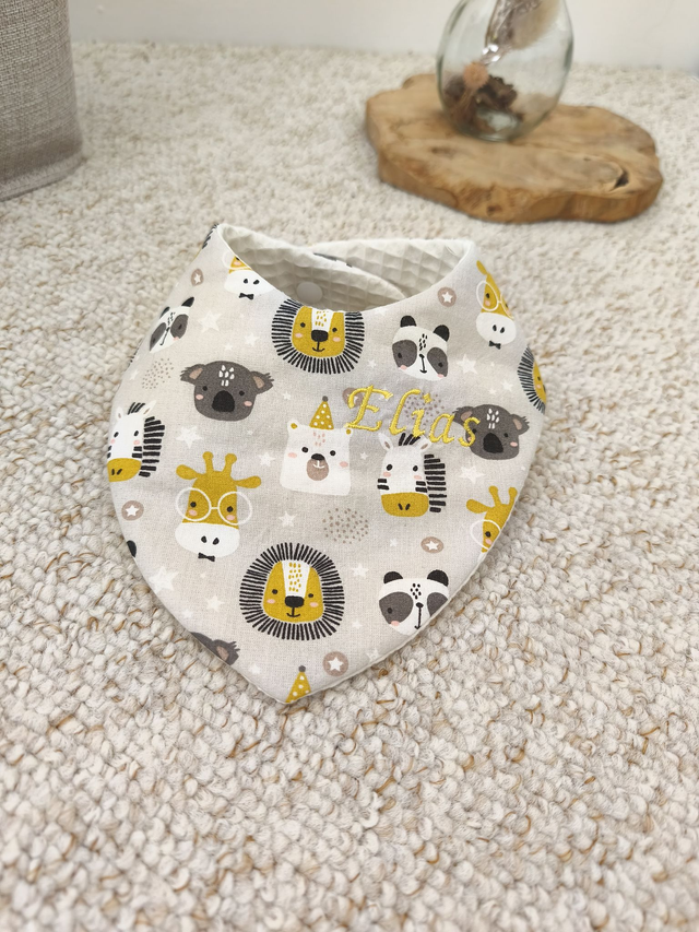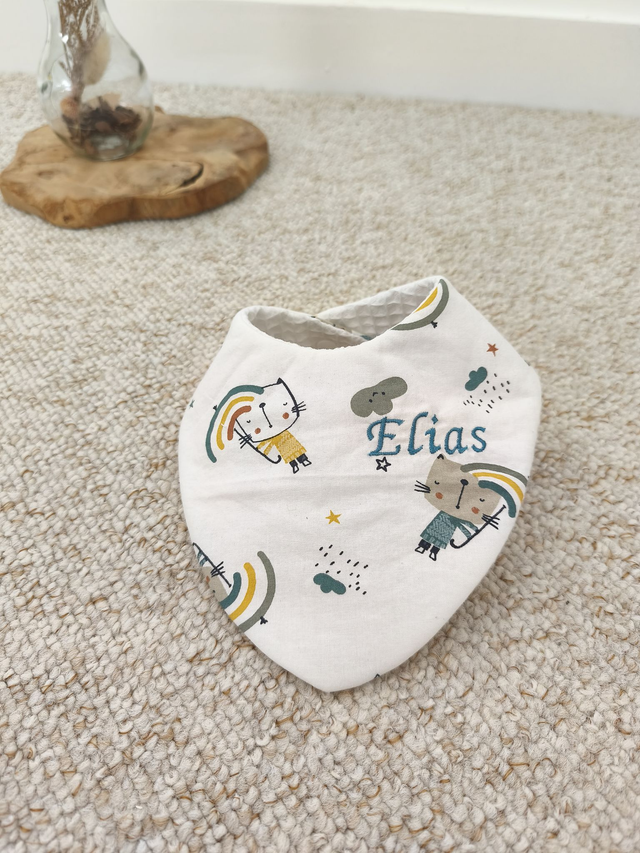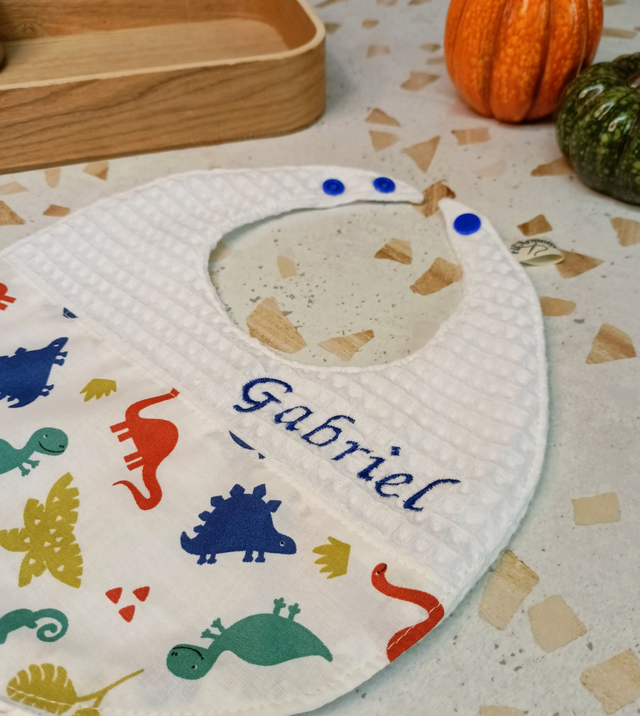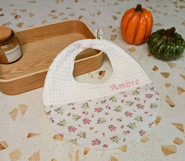 Vous avez la possibilité de personnaliser votre bavoir avec une broderie. Pour m'indiquer ce que vous souhaitez écrire et la couleur, merci de me l'indiquer par message.