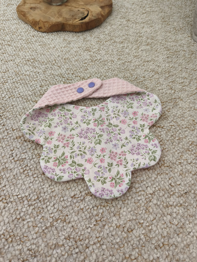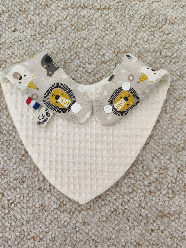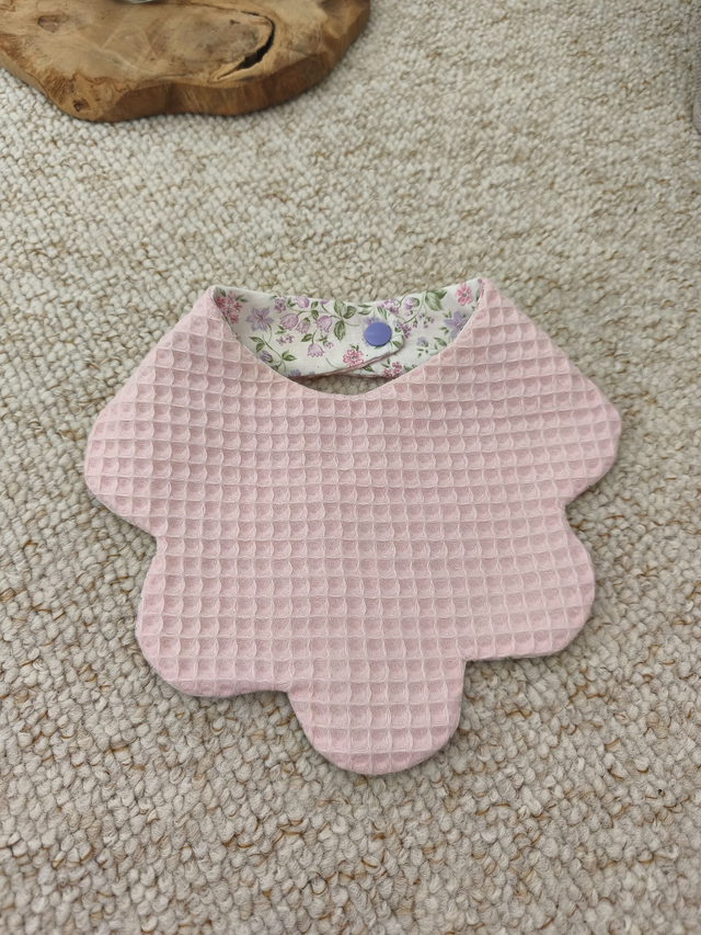 Ce bavoir a une partie en tissu nid d'abeille pour le côté absorption et une partie en coton upcyclé pour le côté coloré.